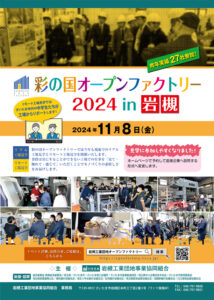 主催イベント! 彩の国オープンファクトリー2024 in岩槻 2024年08月20日 11月8日(金)「彩の国オープンファクトリー2024 in岩槻」を開催致します! 今回で第6回目を迎えます 「みて、ふれて、かんじる」をテーマに皆さまに楽しんで頂けるイベントとなります!! 企画内容等の詳細につきましては、http://openfactory.iicca.jp/ 事前予約制となります 特設サイトからお申込みをお願い致します。